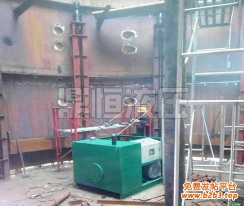 YB-60型液压泵站提升原理利用液压提升装置(成套设备)均布于储罐内壁圆周处,先提升罐顶及罐体的上层(层)壁板,然后逐层组焊罐体的壁板。采用自锁式液压千斤顶和提升架、提升杆组成的液压提升机,当液压千斤顶进油时,通过其上卡头卡紧并举起提升杆和胀圈,从而带动罐体(包括罐顶)向上提升;当千斤顶回油时,其上卡头随活塞杆回程,此时其下卡头自动卡紧提升杆不会下滑,千斤顶如此反复运动使提升杆带着罐体不断上升,直到预定的高度(空出下一层板的高度)。当下一层壁板对接组焊后,打开液压千斤顶的上、下松卡装置,松开上下卡头将提升杆以及胀圈下降到下一层壁板下部胀紧、焊好传力筋板,再进行提升。如此反复,使已组焊好的罐体上升,直到后一层壁板组焊完成,从而将整个储罐安装完哔。