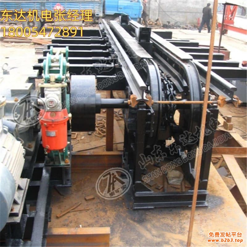 PB、PH 型爬车机采用链式传动,由爬爪、链条、滑道、驱动装置、头轮、尾轮、逆止爪、轨道、支撑梁等组成,采用低速大扭矩液压马达(或电动)驱动。推爪为长起式,若干个爬爪固定在链条上,推矿车车轴或挡板工作,矿车通过时可以将逆止爪压下,矿车通过后自动抬起。逆止爪防止从爬爪脱开的矿车下溜。