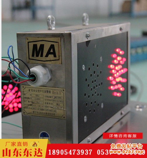 矿用本安型声光报警箱外壳上方有悬挂吊鼻,发光二极管为双色警示灯、双路输出,报警箱能发出红、绿两种颜色的光信号并伴有相应的警示语。