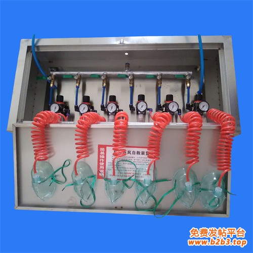 ZYJ-A型矿井压风自救装置,内装六个联成一组,装在不锈钢的箱体内,组成一个井下自救系统,并由地面泵房供气。(瓦斯突出矿井安装多少个组,视其井巷规模,井下工作人员编制的多少而定,一般情况下,井下安呼吸器的个数不得少于井下全员的三分之一)。