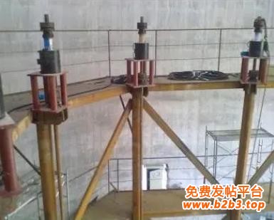 (3)液压提升设备的安装、就位液压提升设备可以分别安装、就位。当所有油路全部接通后,让千斤顶处于松卡状态,先进行全过程试验2^-3次(不加压),然后再进行额定油压试验,观察各油路系统有无泄漏等异常现象,同时检查液压控制柜工作是否正常。接着进行空载试验,检查液压顶的往复运动、提升杆的步进动作及上下卡头的卡紧性能是否可靠。发现不正常应作调整。一切正常后,就可将提升架底板与罐底板焊牢。至此,液压提升设备的安装、就位即完成。