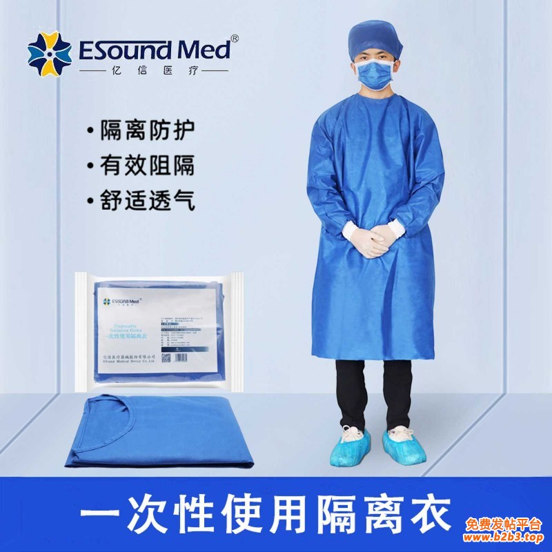 产品名称:亿信一次性使用隔离衣 产品优势:透气、阻菌、隔离液体、无落絮