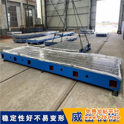 铸铁T型槽平台在浇注完成后开始用振动清沙和人工除沙并清理铸铁平台毛坯周围的废弃物,清沙完哔后铸件自然放凉并开始第一次回火(时效处理),铸件在回火窑升温至780°并在窑种和窑的温度同时降至50°方可出窑。铸铁平台的铸件在粗加工的时候使用的是济南产龙门刨床和断面铣床使铸铁平台四周及上下面成正方形或是长方形,如果需要开T型槽须在刨完平面后放置一天后才能开T型槽或是U型槽、矩型槽等加工。如果在铸铁平台上进行钻孔或是绞螺纹孔也可以用数控龙门铣床进行一次性完成,精度高,光洁度高。