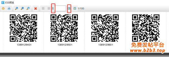 5. 制作完成之后,点击软件顶部的“打印”按钮,在打开的窗口中根据需要设置数据量(这里设置为1000),开始页码为1,点击结束页码后面的“尾页”,然后点击下面的“预览”按钮,翻页查看批量生成的跳号流水号二维码,预览无误就可以直接连接打印机打印出来或者批量输出PDF文档了。